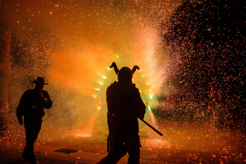 The Corre Foc is where people run with fireworks in their hands, throwing it at your feet to let you move and dance.