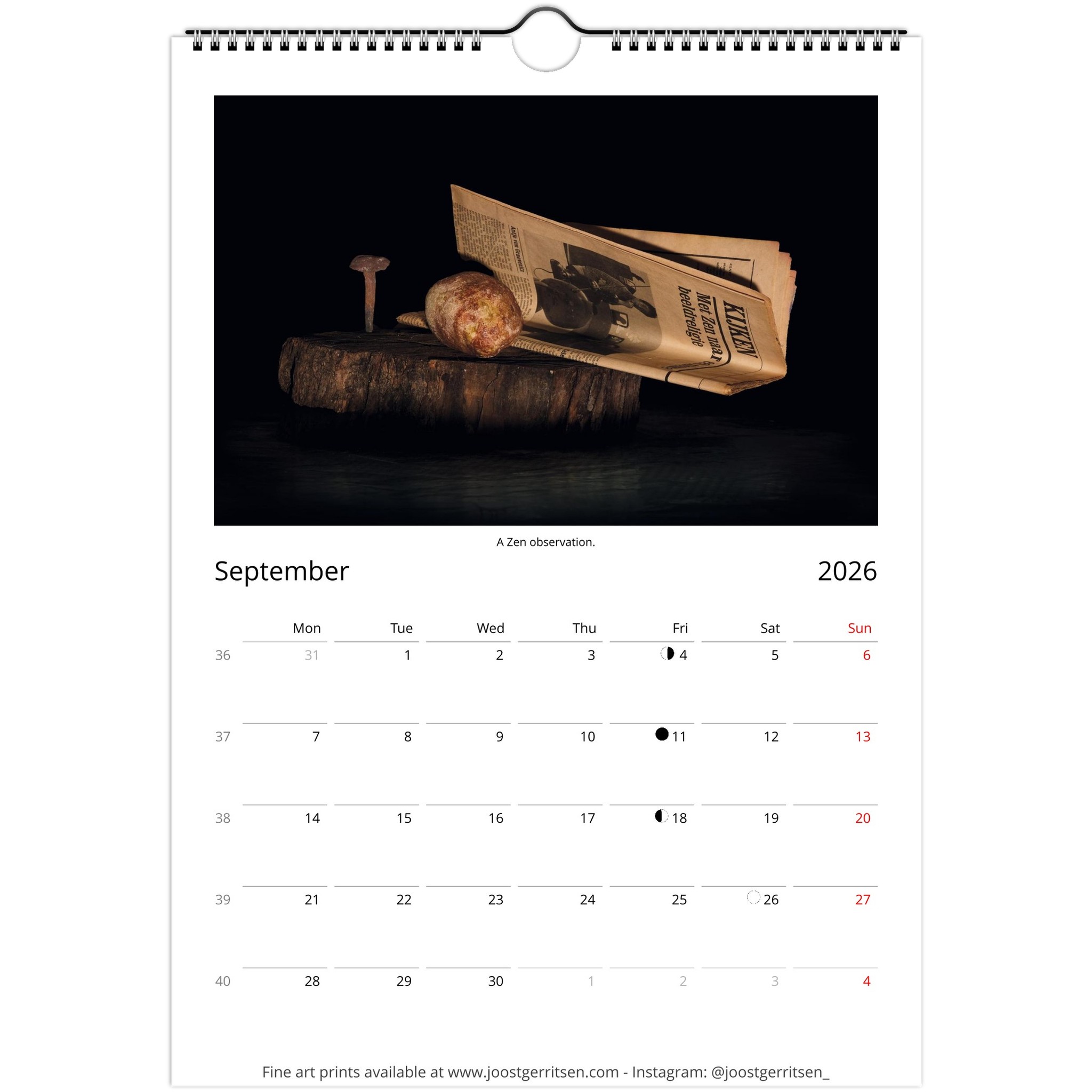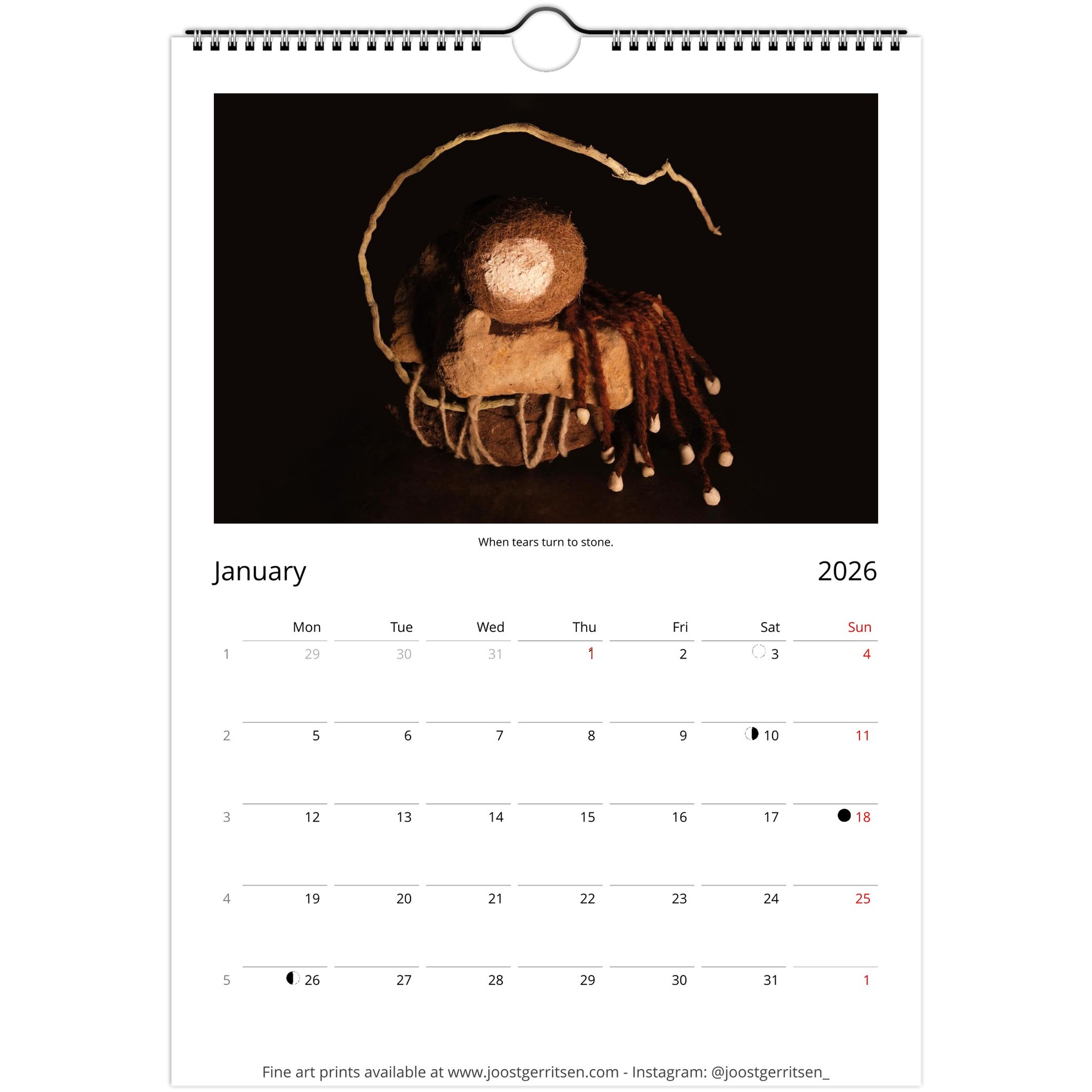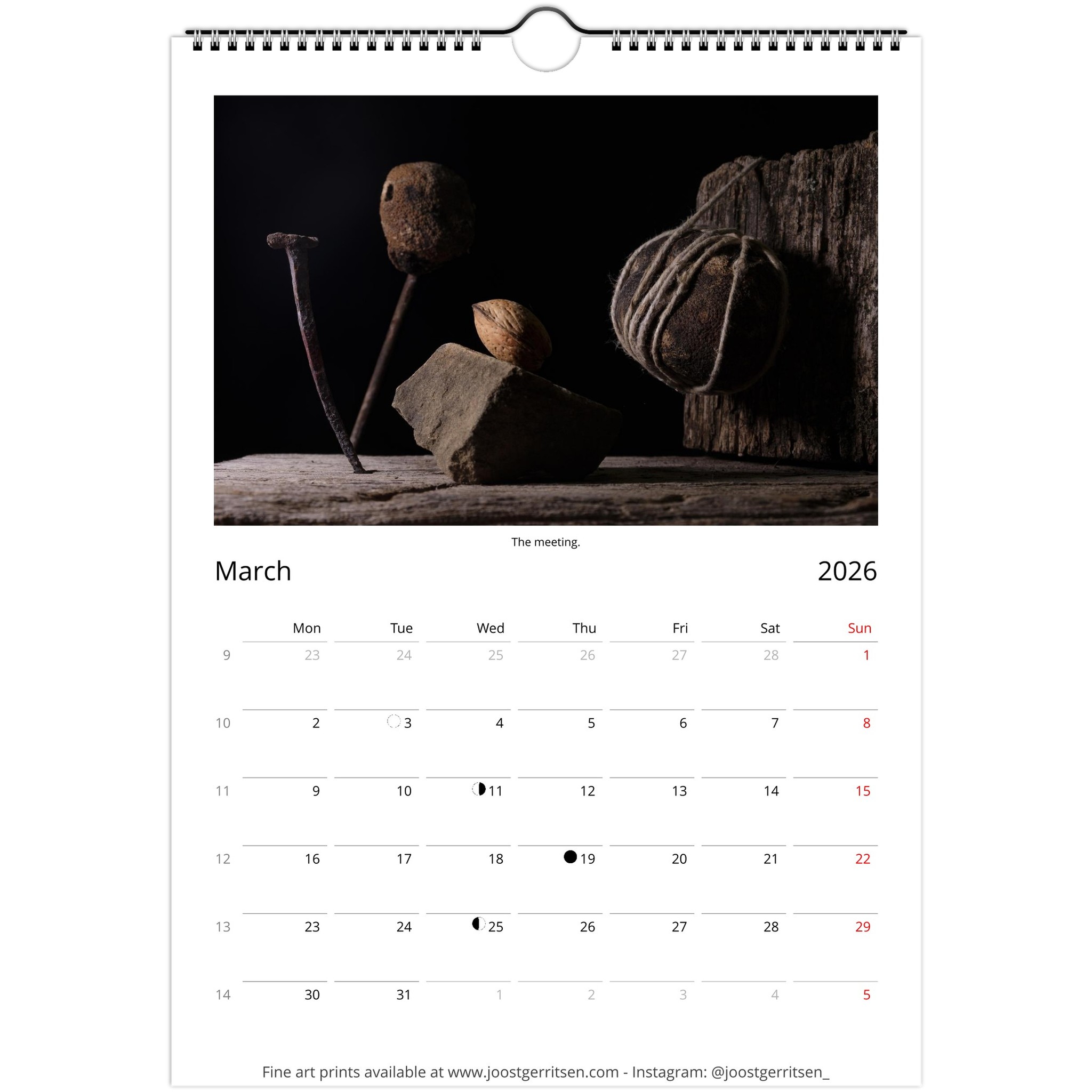 A fine art calendar with a selection of the still life photos I made in 2025. It presents a magical world created from found objects like rocks, fibers, seeds, wood, among others. I like to think about these intimate worlds as encounters with a variety of characters. All things have a soul. It can be that this is a projection of ourselves or indeed a true part of every thing in the universe. For me, making photos from discarded objects brings me closer to nature.